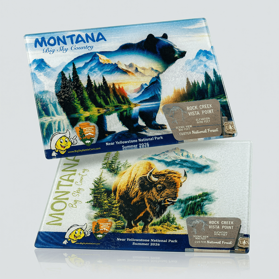 Bring a piece of Montana into your kitchen with our Beartooth Mountain Glass Cutting Board. Featuring scenic-inspired design and crafted from hardened glass, this board blends everyday practicality with mountain character.